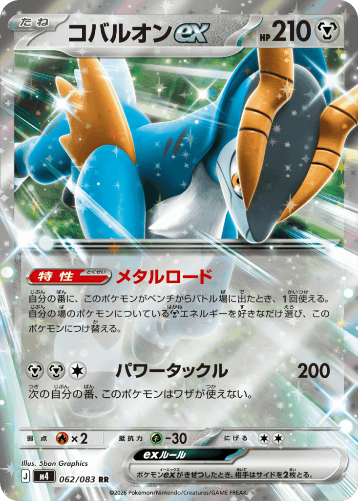 特性:メタルロードに注目。ベンチからバトル場に出たとき鋼エネルギーを好きな枚数コバルオンに付け替えることができる。