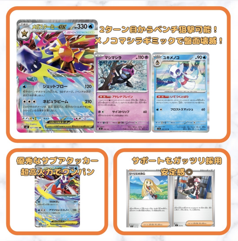 2ターン目から動かすことができる高スペックアタッカーのメガスターミーexにメノコマシラギミックを合わせたデッキだ。