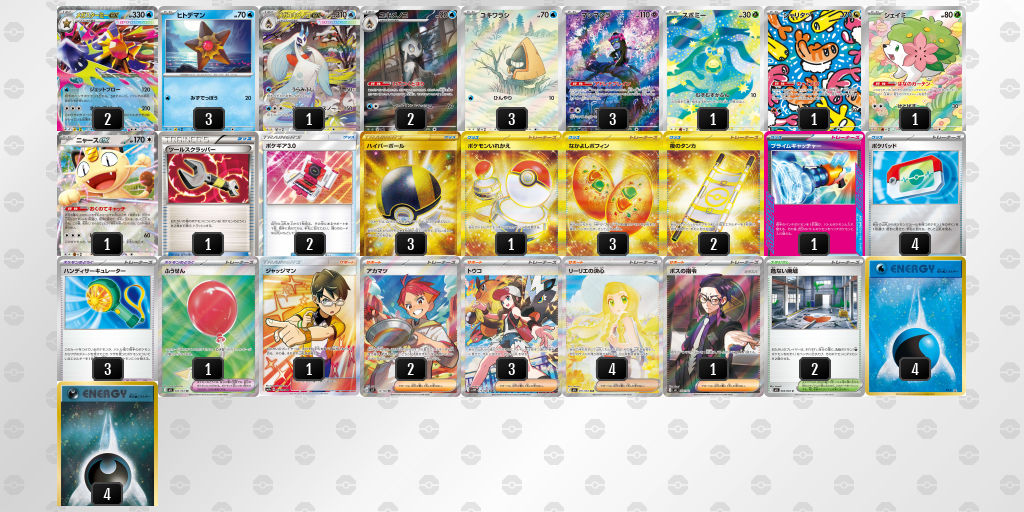 対策する側はかなり大変なデッキだと思うけど、メガスターミーをワンパンできるポケモンやシェイミ、バトルコロシアム辺りで抗えるデッキを組んでいきたいね。